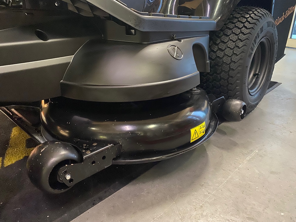 102 cm breites Mähdeck mit zwei synchronisierten Messern sowie Stützrädern. Die Schnitthöhe kann in sieben verschiedenen Stufen, von 30 bis 90 mm, eingestellt werden. Über die elektromagnetische Messerkupplung kann das Mähwerk aus- und eingekuppelt werden.