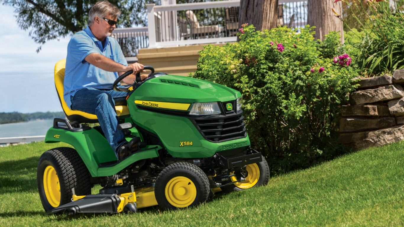 Der Alleskönner X584 mit Allradlenkung führt Sie sicher auf allen Wegen, erleichtert Ihre Gartenarbeit und meistert schwierige Situationen. Die große Spurweite verbessert die Stabilität an Hängen. Die Traktion kann durch Betätigen der Differenzialsperre erhöht werden. Der robuste Rahmen sorgt für stabile Fahreigenschaften und Ausstattungsmerkmale wie eine an Bord integrierte Messlehre zum Einstellen des Mähwerks stellen sicher, dass Sie immer beste Ergebnisse erzielen. Darüber hinaus profitieren Sie von Servolenkung und hydraulischem Mähwerkaushub, die Ihnen in hohem Maße die Bedienung erleichtern.Mit MulchControl für maximale Leistung sowie Flexibilität beim Mähen und Mulchen. Dieses innovative System lässt Sie beliebig zwischen Seitenauswurf und Mulchen durch Umlegen eines Hebels wechseln.